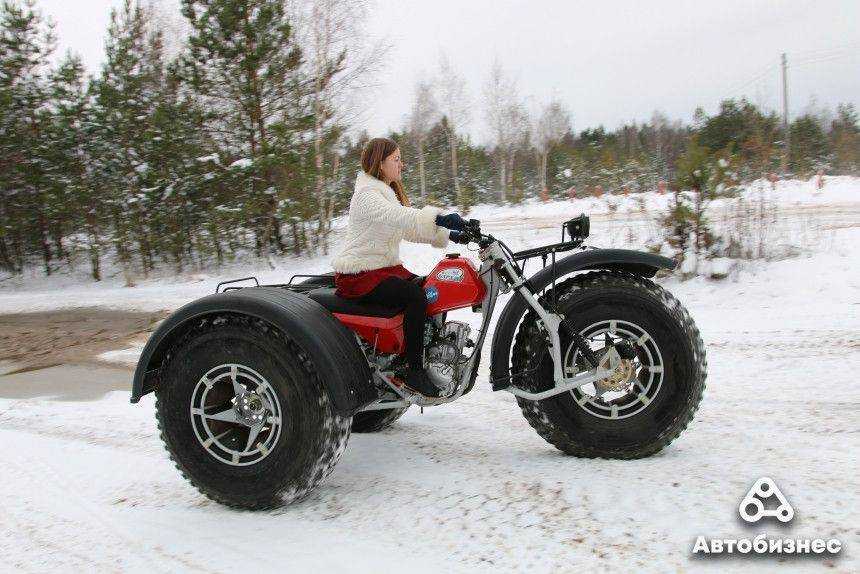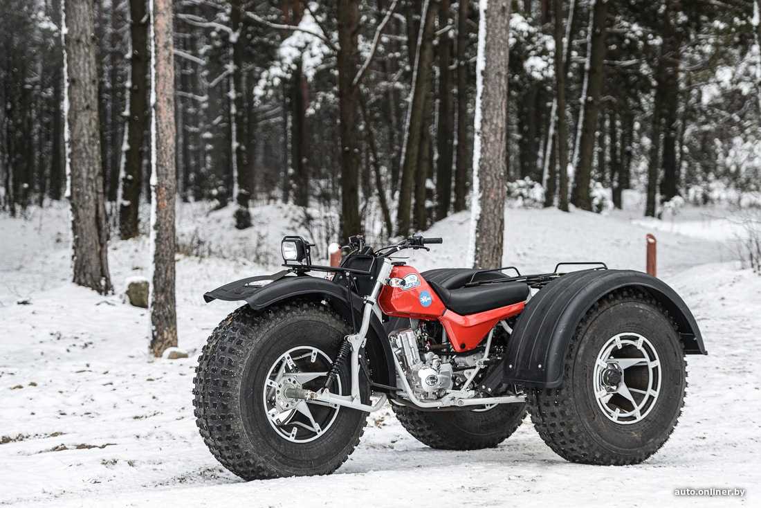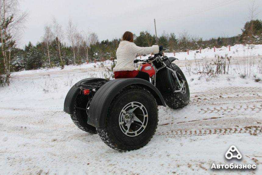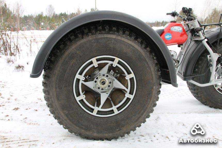 Конструкторы вездехода применили беспроигрышную формулу – совместили большие колеса и малый вес техники. Кроме того, добавилось несколько новаторских решений. На трехколесный вездеход установлены шины низкого давления, увеличенная вилка и модернизированный мотор. В итоге получился трицикл с впечатляющими параметрами, который быстро и с успехом занял нишу среди своих конкурентов.