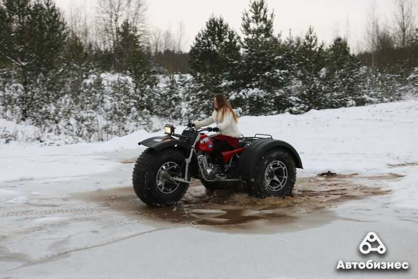Едет «Бархан» откровенно медленно, но это и хорошо. На высоких скоростях 3-колесный вездеход ощущался бы нестабильным и был бы не прочь перевернуться. Все же по устойчивости модель далека от квадроциклов. Зато «Бархан» выигрывает как у «квадриков», так и у снегоходов по проходимости и универсальности. Особенно если речь идет о болотистой местности. Вездеход способен перевозить на себе до 150 кг груза и тащить прицеп массой до 200 кг.