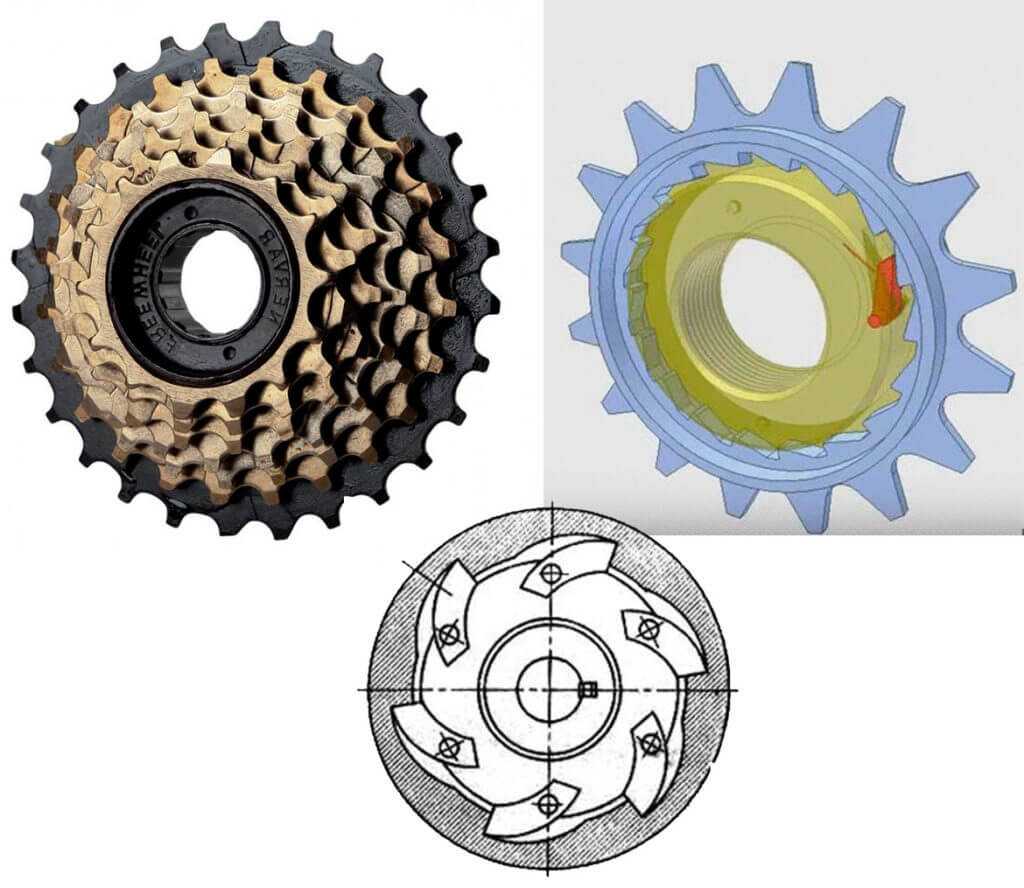 Тормозная втулка заднего колеса велосипеда. Внутреннее кольцо обгонной муфты (поз. 6 вверху) посредством роликов заставляет вращаться внешнее кольцо (поз. 5 внизу) —