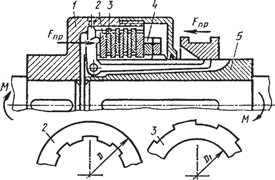 В этих муфтах имеются две группы дисков: внутренние 2 и наружные 3. Наружные диски с D1 соединены с полумуфтой 1, а внутренние c D – с полумуфтой 5 посредством подвижного шлицевого соединения. Правый крайний внутренний диск опирается на регулировочные гайки 4; на левый крайний диск действуют силы нажатия от механизма управления. При этом сила нажатия будет передаваться на все поверхности трения.