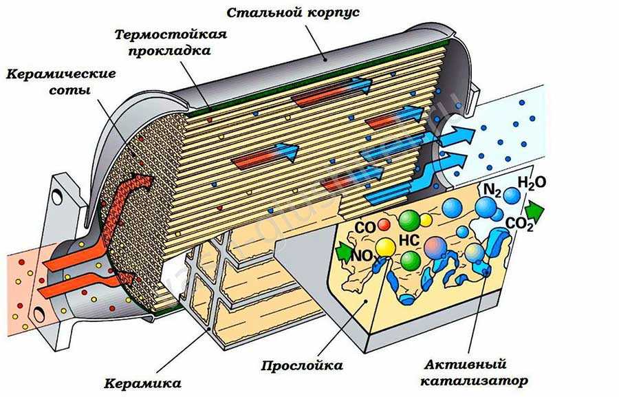 При контакте выхлопных газов с этими элементами происходит химическая реакция, в результате которой из катализатора выходит азот и углекислый газ. Драгоценные металлы играют роль ускорителей, обеспечивающих более быстрое сжигание вредных элементов.