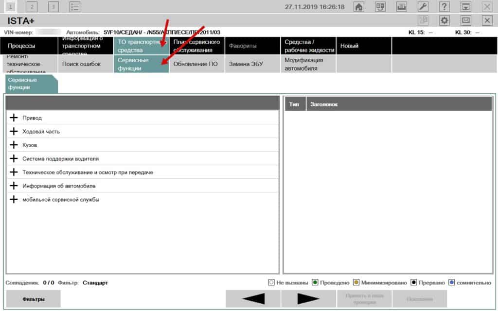 Далее откройте вкладку ТО транспортного средства → Сервисные функции. Тут находятся функции, с помощью которых можно разжать колодки, сбросить адаптацию раздатки (если у вас полный привод) и многое другое. Рекомендуем ознакомиться со списком самостоятельно, который разделен на категории.