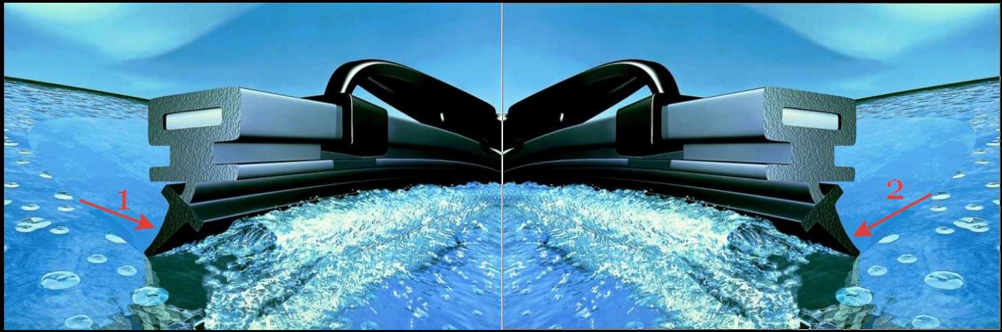 Если скрип производит одна из щеток, то необходимо определить, при работе в каком направлении появляется неприятный звук. Причиной такого скрипа может быть то, что гребешок резинки щётки установлен не перпендикулярно лобовому стеклу. Принцип работы профиля резиновой ленты дворника заключается в том, что он как бы «затирает» воду на лобовом стекле, кончик гребешка всегда отстаёт от корпуса дворника на несколько миллиметров (положение 1 на рисунке).