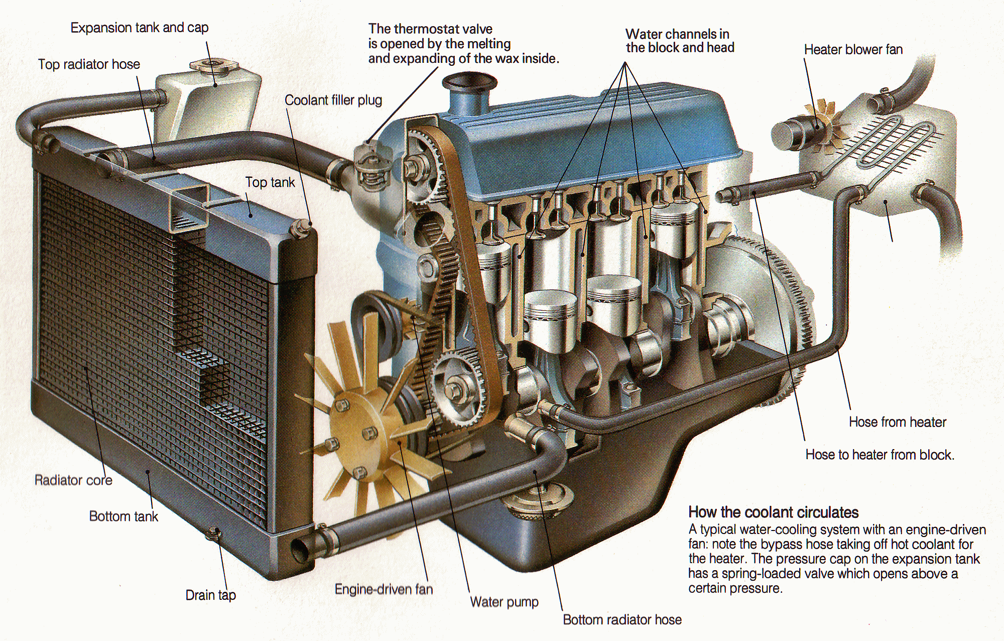 Когда охлаждающая жидкость перемещается по системе с помощью водяного насоса, она проходит через два основных компонента:
