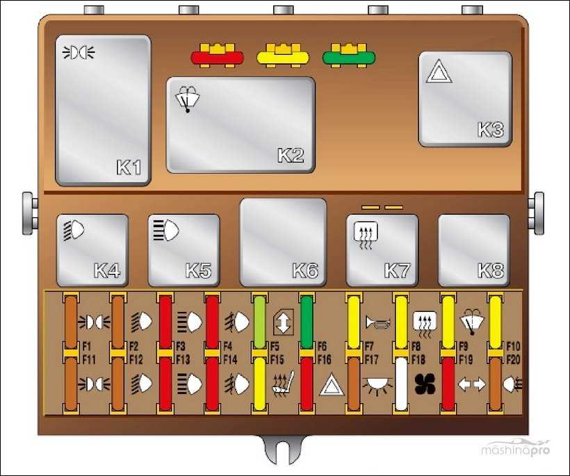 Кроме предохранителей в основном монтажном блоке мы найдём семь или восемь реле. Их количество зависит от модификации автомобиля. Чаще всего на месте реле К8 бывает пусто, поскольку там устанавливают реле задних противотуманных фонарей.