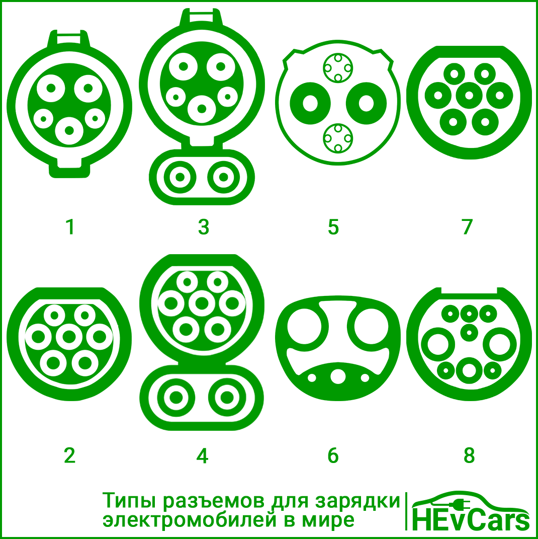 Медленная зарядка (AC): 1. Type 1 J1772 (США/Япония) 2. Type 2 Mennekes (Европа) 7. GB/T (Китай) Комбинированная зарядка (AC/DC): 3. Type 1 CCS Combo 1 (США/Япония) 4. Type 2 CCS Combo 2 (Европа) Быстрая зарядка (DC): 5. CHAdeMO (США/Япония) 6. Tesla Supercharger (США/Япония) 8. GB/T (Китай)
