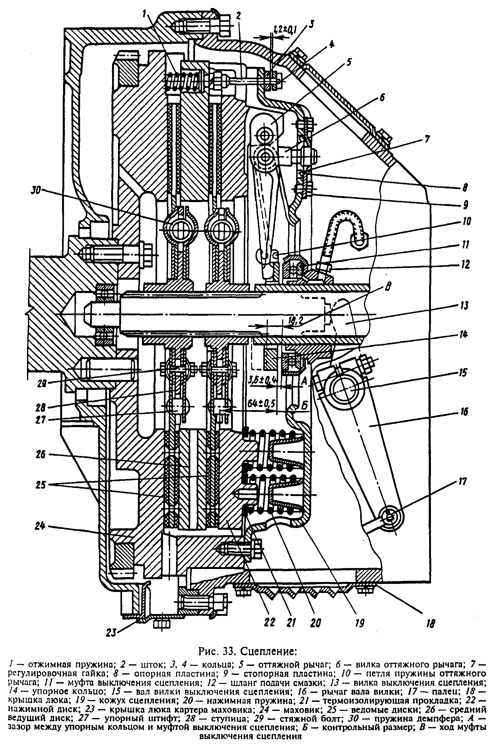 В эксплуатации предусмотрены две регулировки привода сцепления: 1. Регулировка зазора между торцом крышки корпуса клапана и регулировочной гайкой 18 (рис. 15). 2. Регулировка свободного хода педали сцепления.