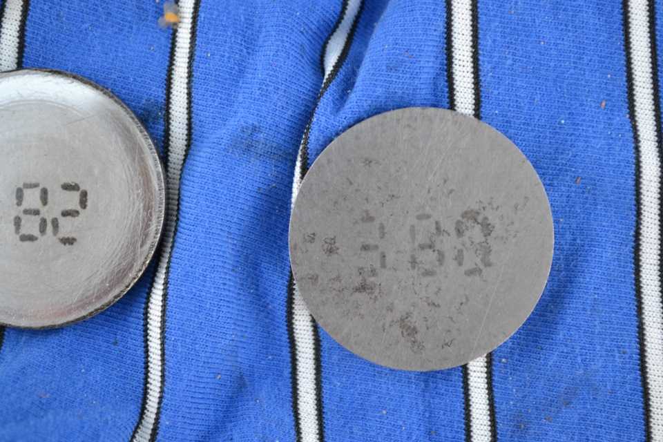 Установку новой детали производят исходя из лазерной метки , на нижней стороне извлеченной детали, например, 3,5 мм. При отсутствии метки замер осуществляется микрометром. Проверка показывает, зазор выхлопного клапана, например 0,44 мм. Зазор превышает фиксированный на 0,09 мм. Стало быть, понадобится шайба толщиной 3,94 мм. В наборе такого размера может не быть. В этом случае подбираем размер, близкий к требуемой цифре.