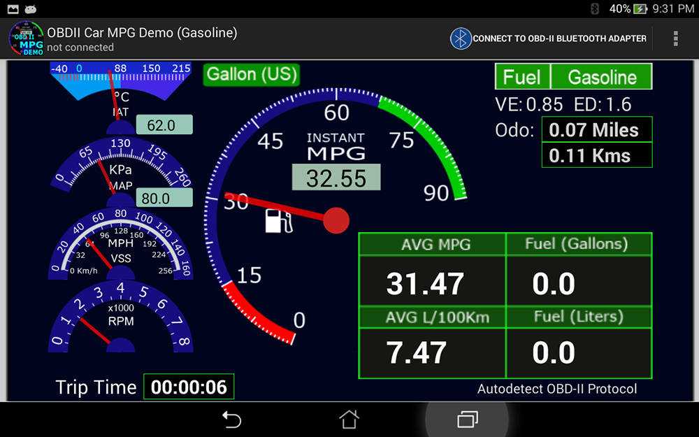 Приложение, динамически отслеживающее характеристики работы важных узлов автомобиля. Ведёт статистику расхода горючего (мгновенного, за небольшой промежуток времени, за поездку, средний расход за час), используя данные, поступающие в MAF или датчиков на инжекторе.