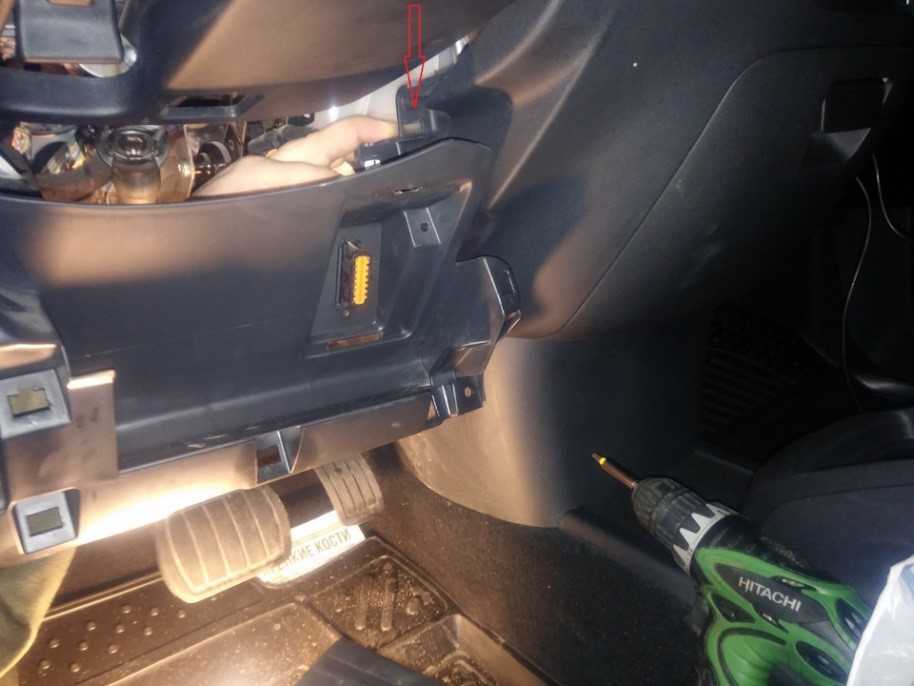 В салоне установочный бокс находится слева от рулевой рейки под пластиковой накладкой.
