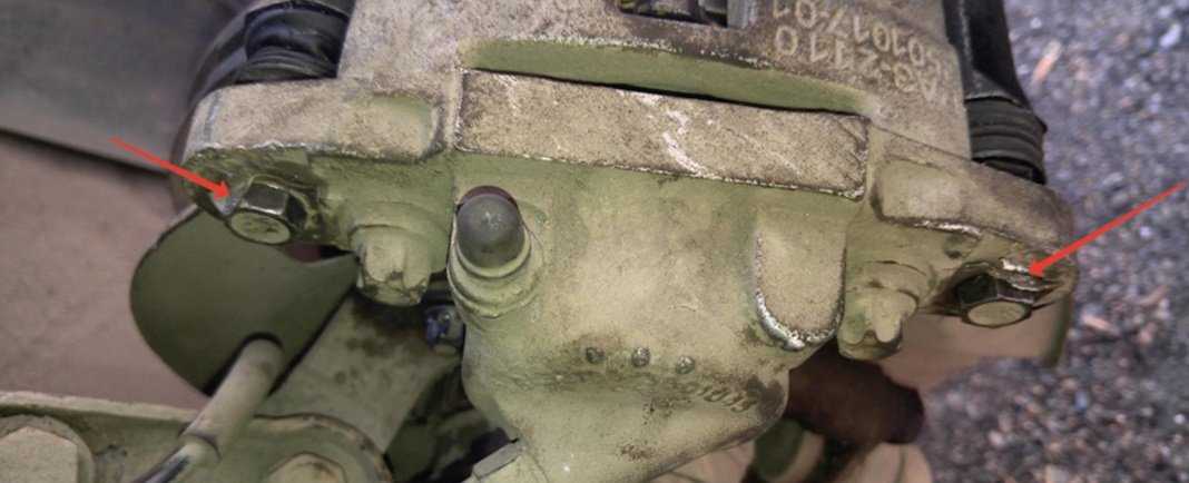 - Открутить два болта суппорта ключом на 17. На схеме отмечены два болта тормозного суппорта