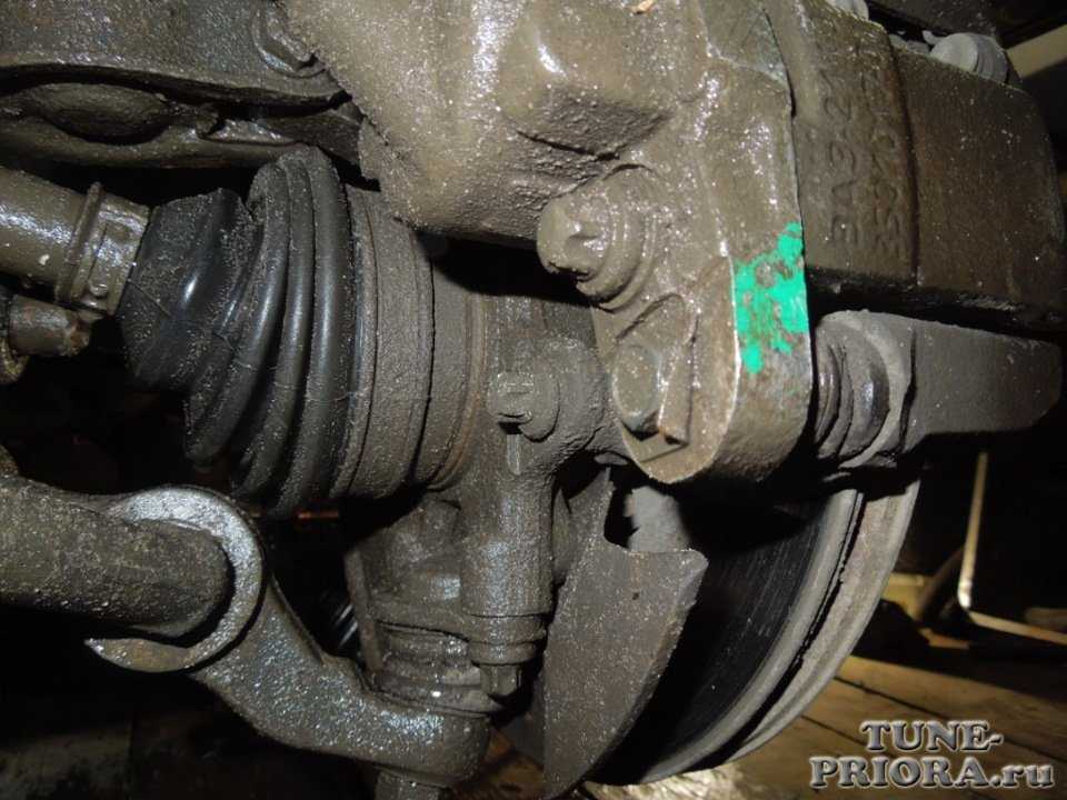 Для начала следует поднять машину (посредством домкрата) и снять колесо, в тормозной системе которого имеется неисправность. На Ладе «Приора» передний суппорт крепится к кронштейну с помощью стяжных болтов М 17. Один находится в верхней части всей конструкции, а другой с нижней. Затянуты они довольно туго, потому, для более аккуратного и легкого их свинчивания накидным ключом рекомендуется предварительно обработать их проникающей смазкой. Ослабив болты при помощи ключа, далее лучше свинчивать их специальной «трещеткой», которая значительно ускорит весь процесс.