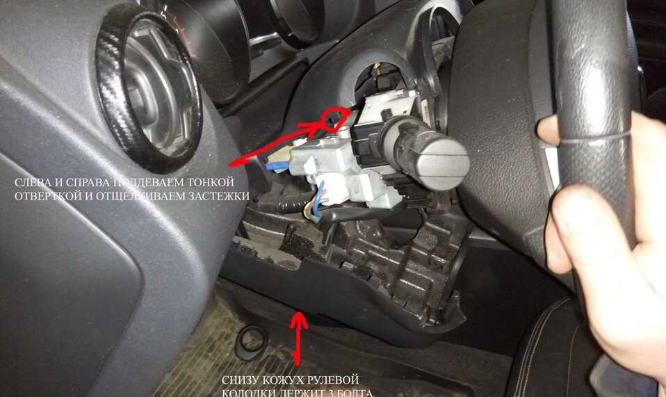 - Демонтаж трех болтов, расположенных под кожухом, скрывающим рулевую колодку.