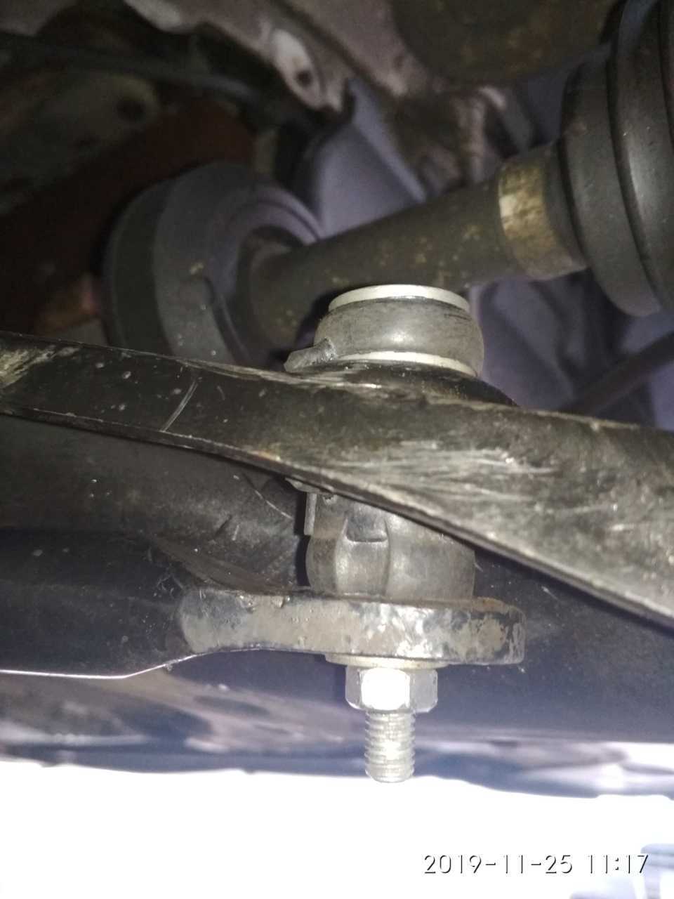 - между поджатым стабилизатором и передним рычагом заводим резиновую втулку;